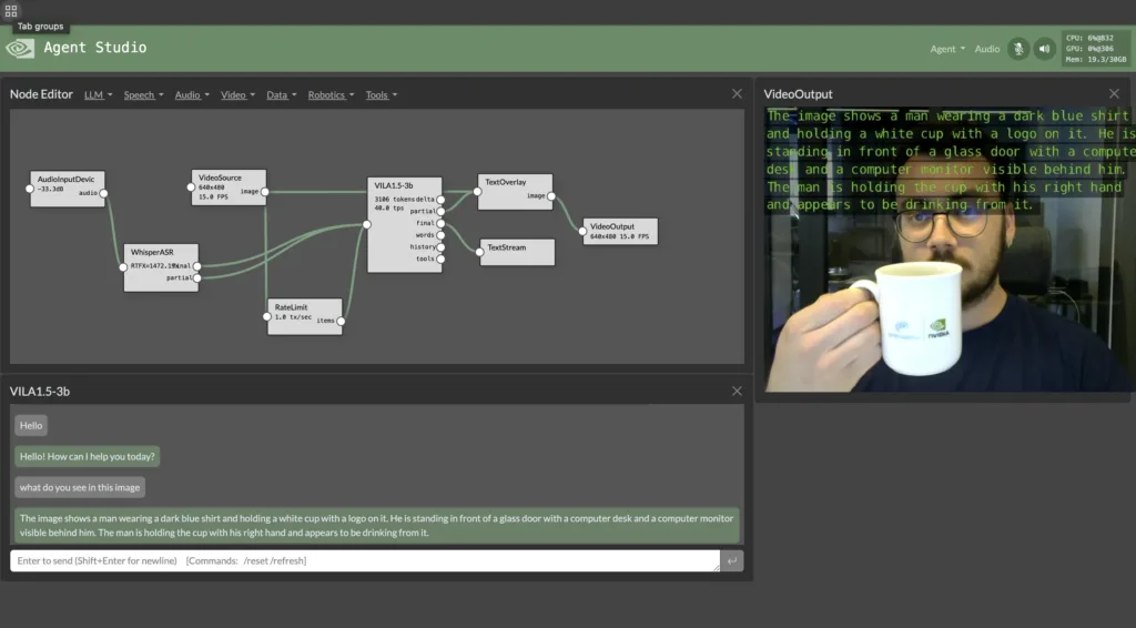Rapidly design and experiment with creating your own automation agents, personal assistants, and edge AI systems in an interactive sandbox for connecting multimodal LLMs, speech and vision transformers, vector databases, prompt templating, and function calling to live sensors and I/O. Optimized for deployment onboard Jetson with on-device compute, low-latency streaming, and unified memory.