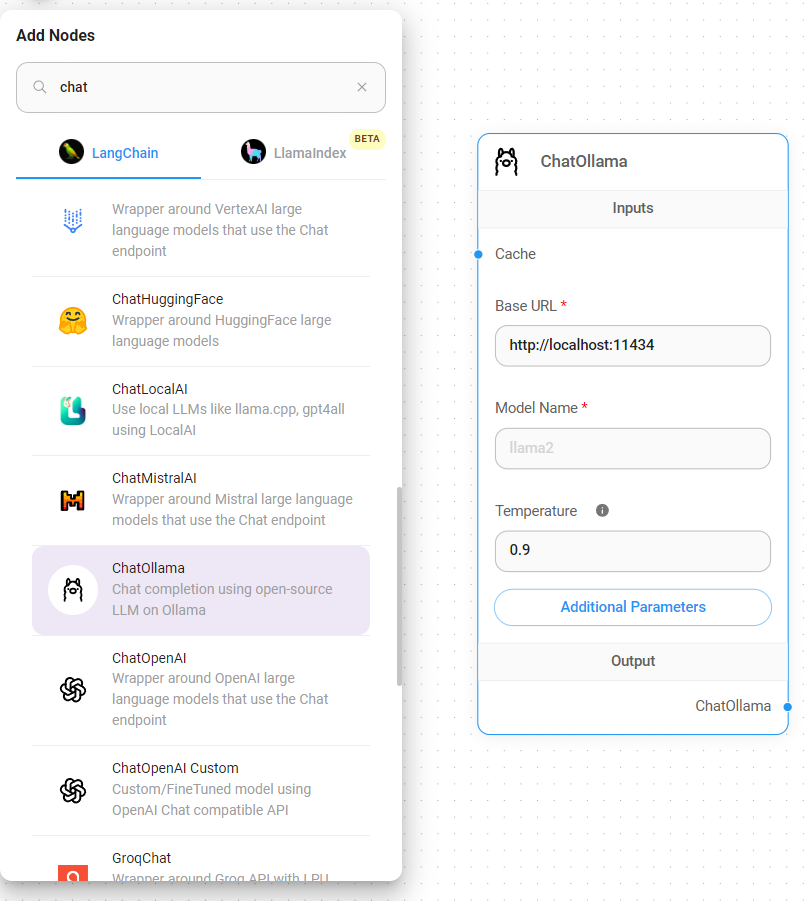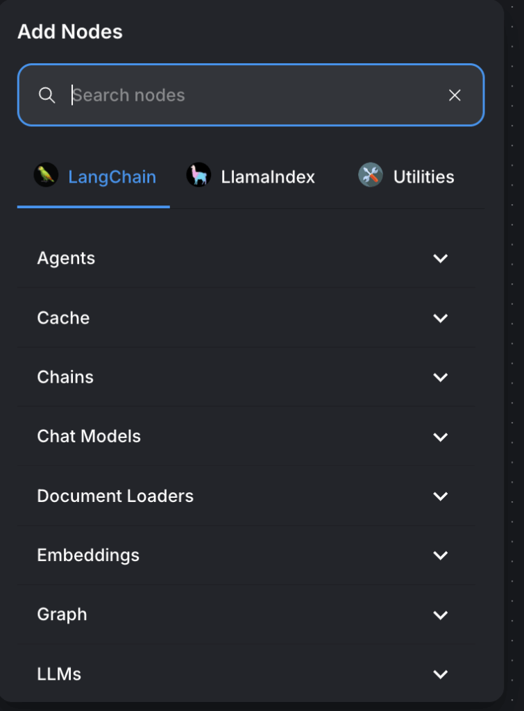 When you’re building workflows, you’ll see different node categories organized logically. LangChain nodes give you the core components and chains, while LlamaIndex nodes are specifically for RAG applications. There are Utility nodes for helper functions, Agent nodes for autonomous components, and Chat Model nodes that connect to different LLMs like Ollama or OpenAI. You’ll also find Document Loaders for processing files and Embedding nodes for vector operations.