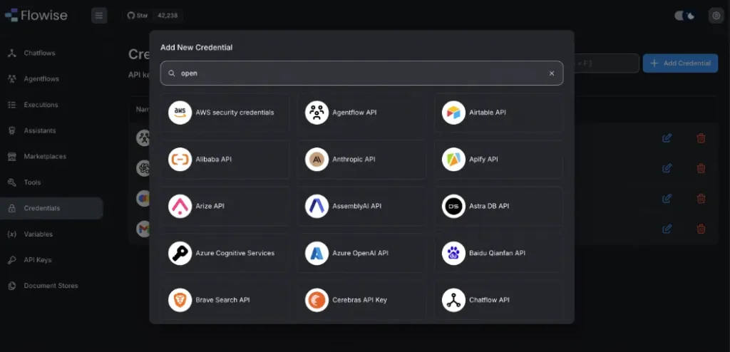 Main Flowise dashboard showing sidebar navigation, management options, and credentials setup.