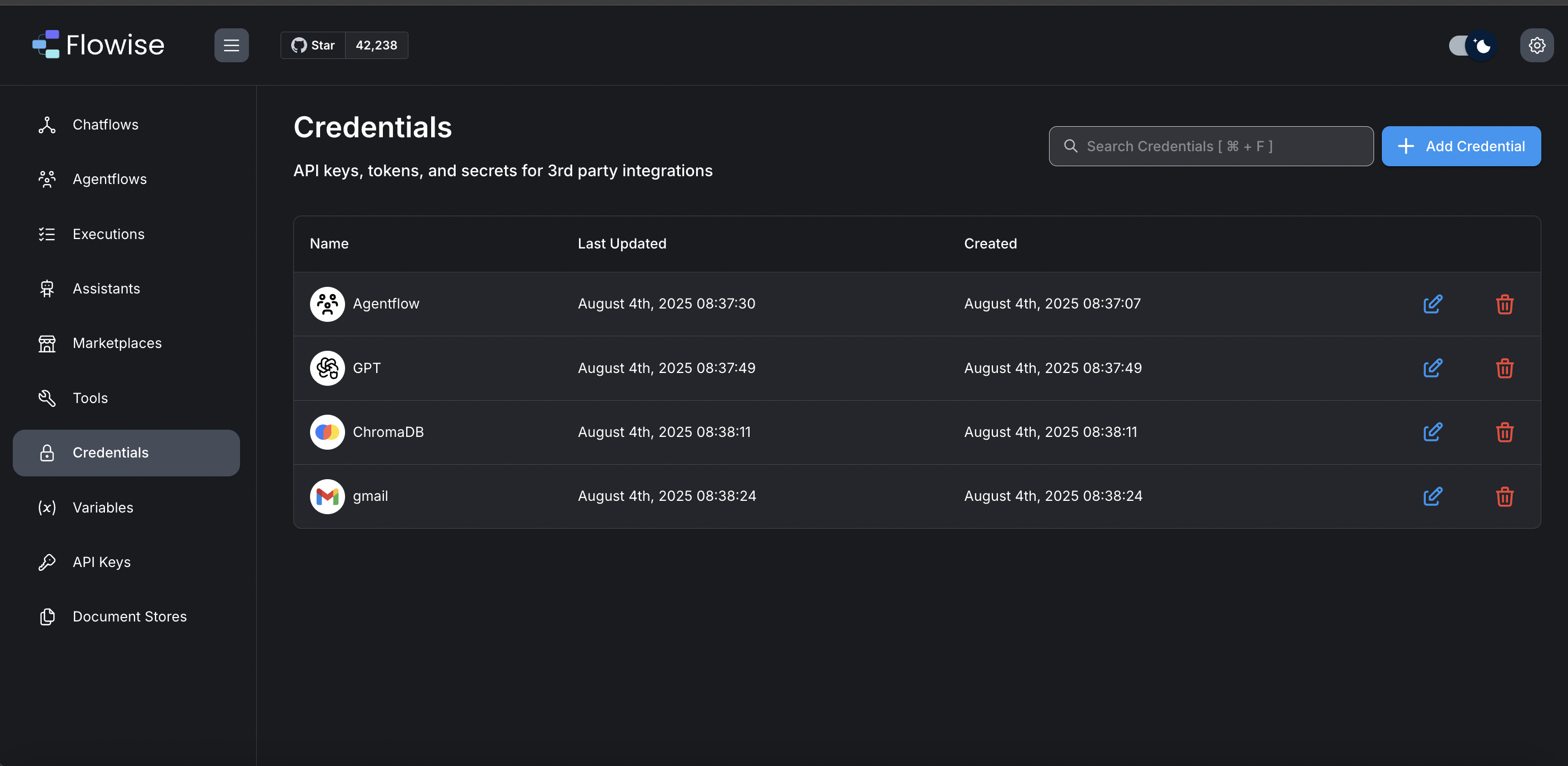 There are separate sections for Tools and utility functions, Assistants for managing your deployed AI instances, and Executions where you can see how all your workflows are performing. The Document Stores section is where you upload files for your knowledge base, while API Keys and Credentials handle all your authentication securely.