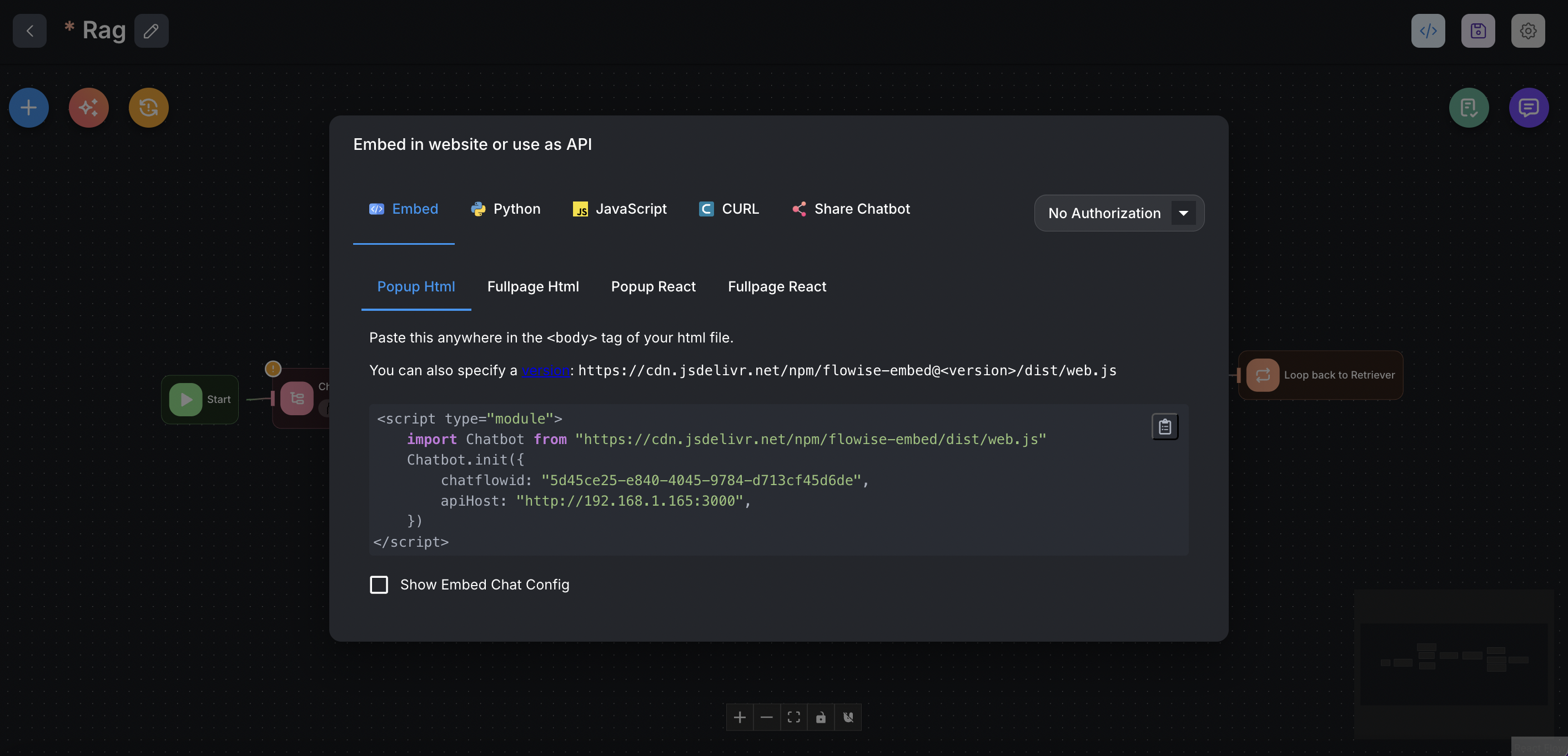 There are 5 options for deployment (</> button). Flowise makes it really easy to embed your chatbots into websites. You can choose from a popup widget that floats on your page, a fullpage dedicated chat interface, or if you’re using React, there are specific React components for both popup and fullpage implementations.