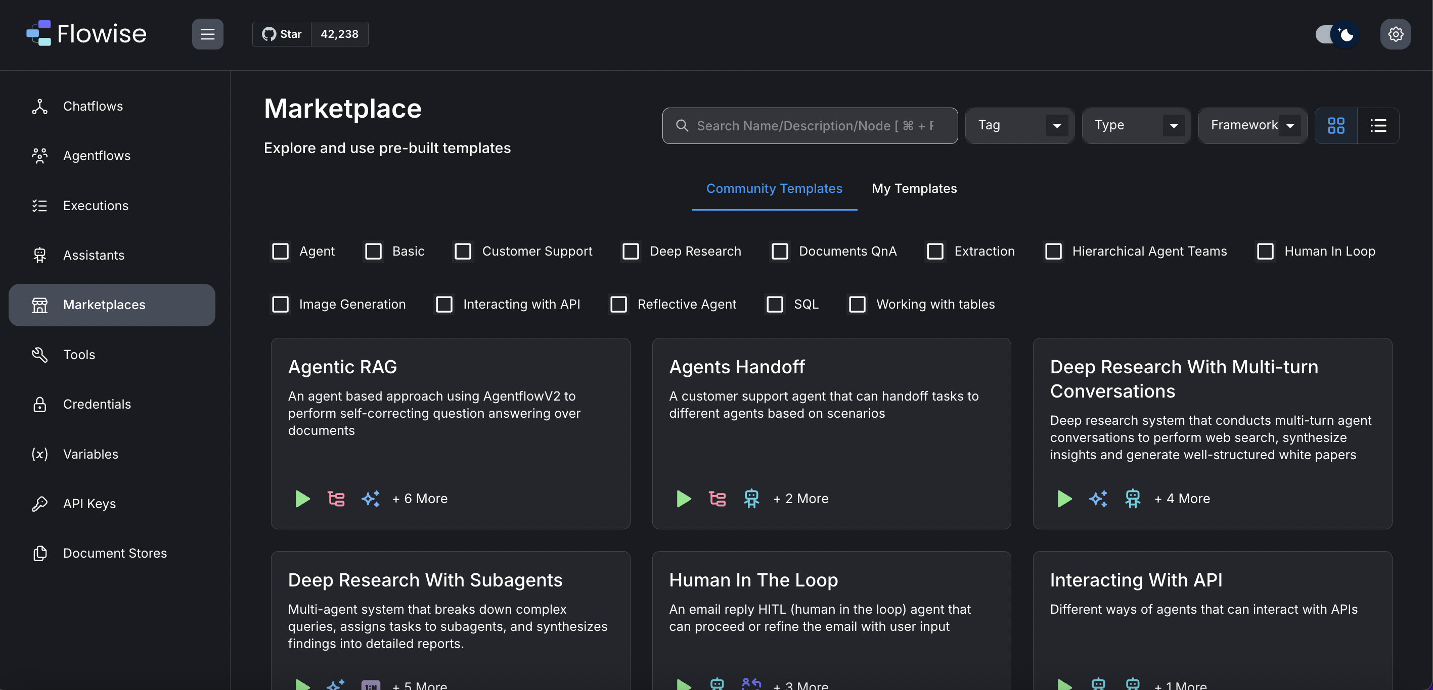 Once you’re inside Flowise, you’ll find all the management tools neatly organized in the sidebar. The interface is pretty intuitive – you’ve got your Chatflows for basic conversational AI, Agentflows for more complex multi-agent setups, and a Marketplace full of templates from the community.