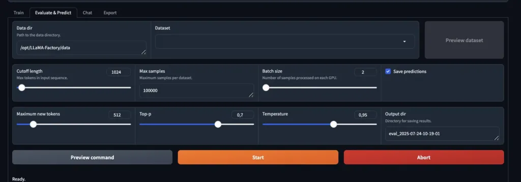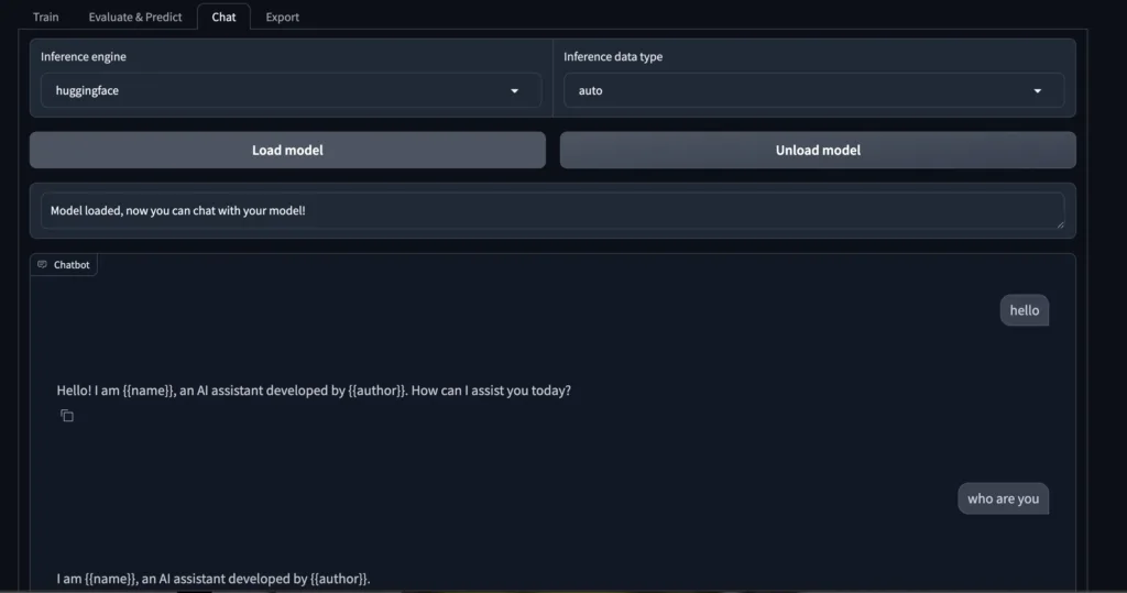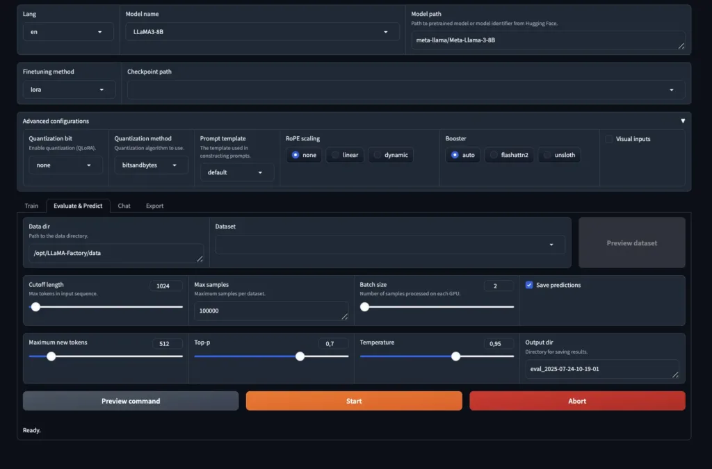• Gradio-based web UI with Train, Evaluate & Predict, Chat, and
