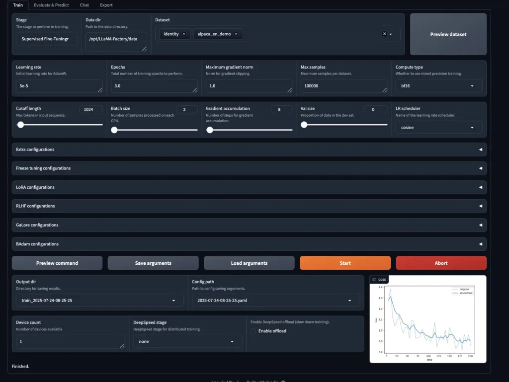 • Advanced configurations for quantization, LoRA, RLHF, and more