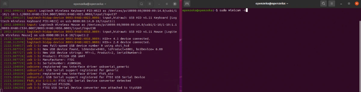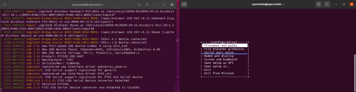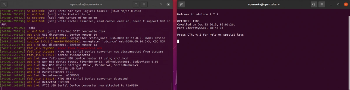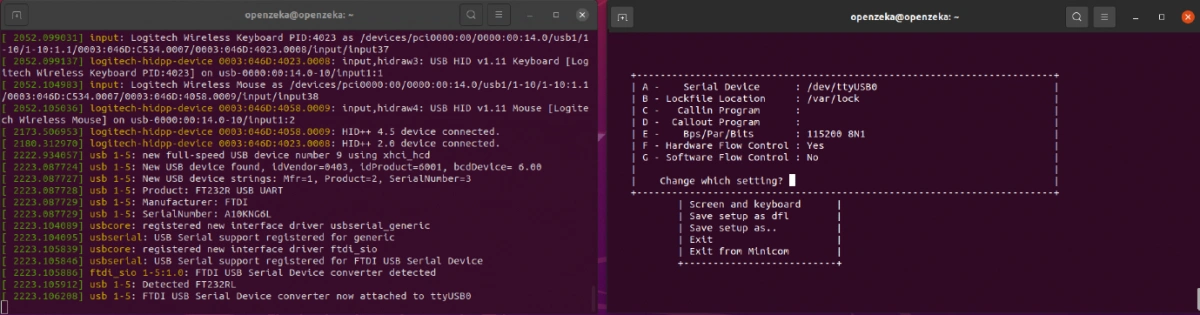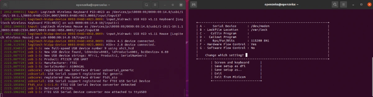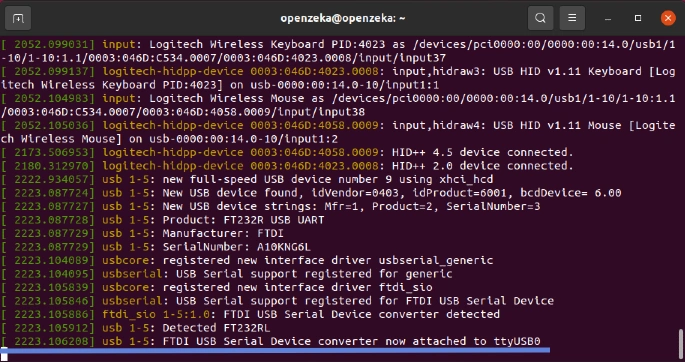 In that log, the line that mentions FTDI refers to our USB converter, and ttyUSB0 is the port it is using. We will use this port name when setting up Minicom.